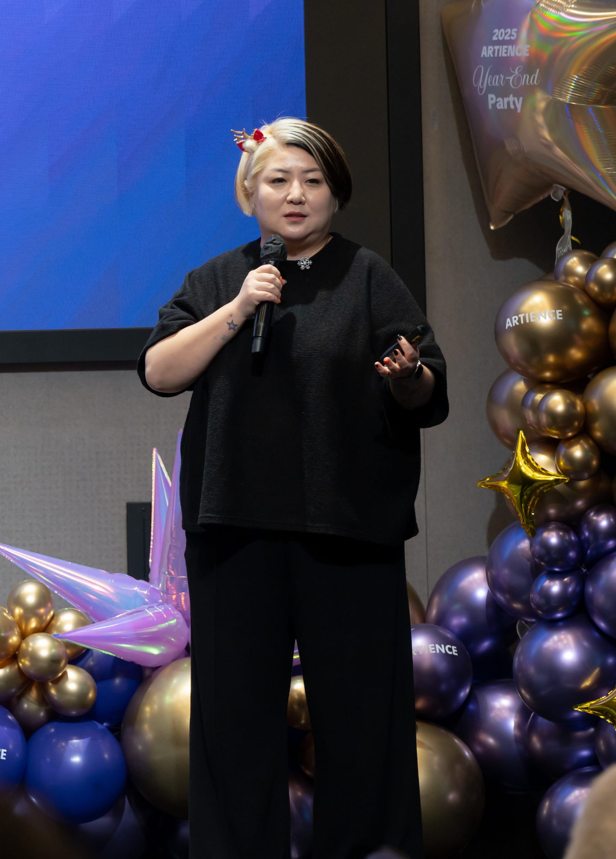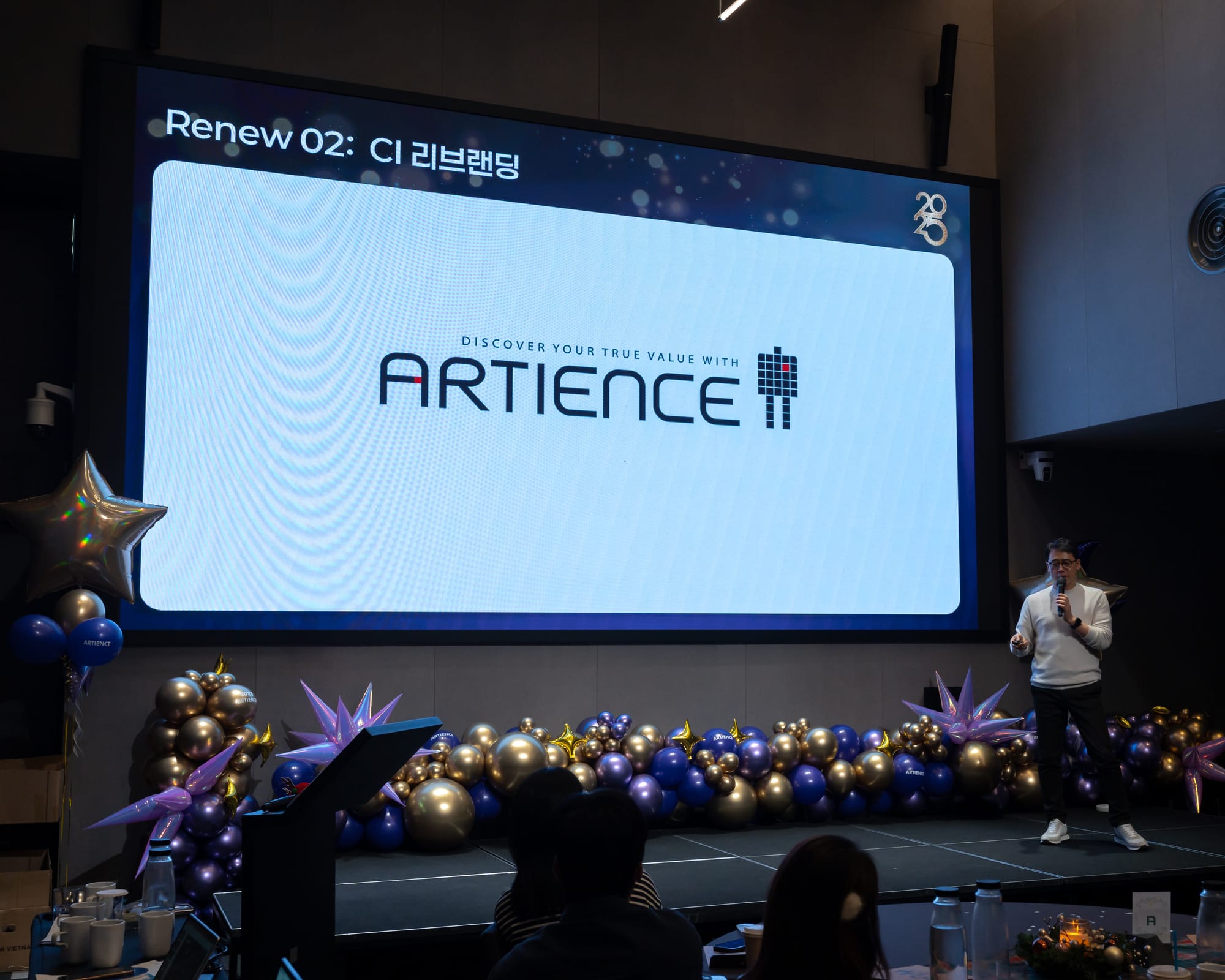 바로 아티언스의 New CI 선포와 신사옥 발표가 있었습니다! 아티언스의 정체성을 새롭게 정의한 CI와 여기에 우리들만의 보금자리인 '신사옥 발표' 소식까지! 더 쾌적하고 멋진 공간에서 함께하게 될 생각에 벌써부터 설레네요. 🏢✨ 대표님이 아티언서들을 위해 준비하신 이 깜짝 선물은 2025년 송년회의 가장 감동적인 피날레가 되었습니다.