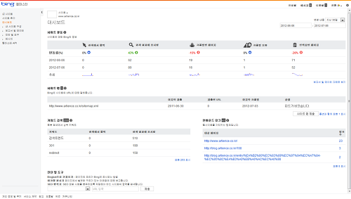 밑에 그림은 빙 웹마스터툴의 Dash Board 캡쳐 한것인데요, 기본 설정 상태인데도 상당히 많은 정보를 세세하게 보여줍니다.