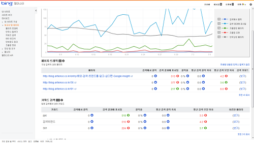 구글의 웹마스터 툴의 경우 최상위 메뉴 클릭을 해도 데이터 가 보여 지지 않고 세부 메뉴로 들어 가야 데이터를 볼수 있는 반면 빙의 웹마스터 툴은 세부 메뉴로 타고 들어 갈 필요 없이 최상위 메뉴를 클릭하면, 그 메뉴의 있는 데이터틀을 쉽게 볼수가 있어서 매우 유용하답니다.